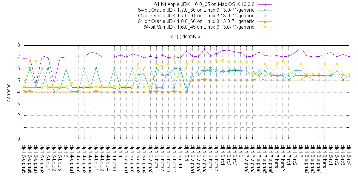 (identity x) notes: It is a good bet that most of this measured time is the per-loop overhead in criterium of updating two primitive long loop locals, and saving the return value in a Java array, although the version of criterium used may actually try to estimate and remove that overhead from the time values it reports. This same overhead is present in all of the benchmarks, but much less noticeable when the expression takes longer to evaluate.