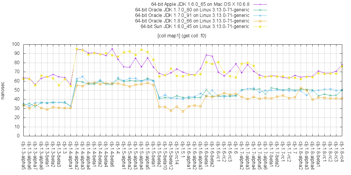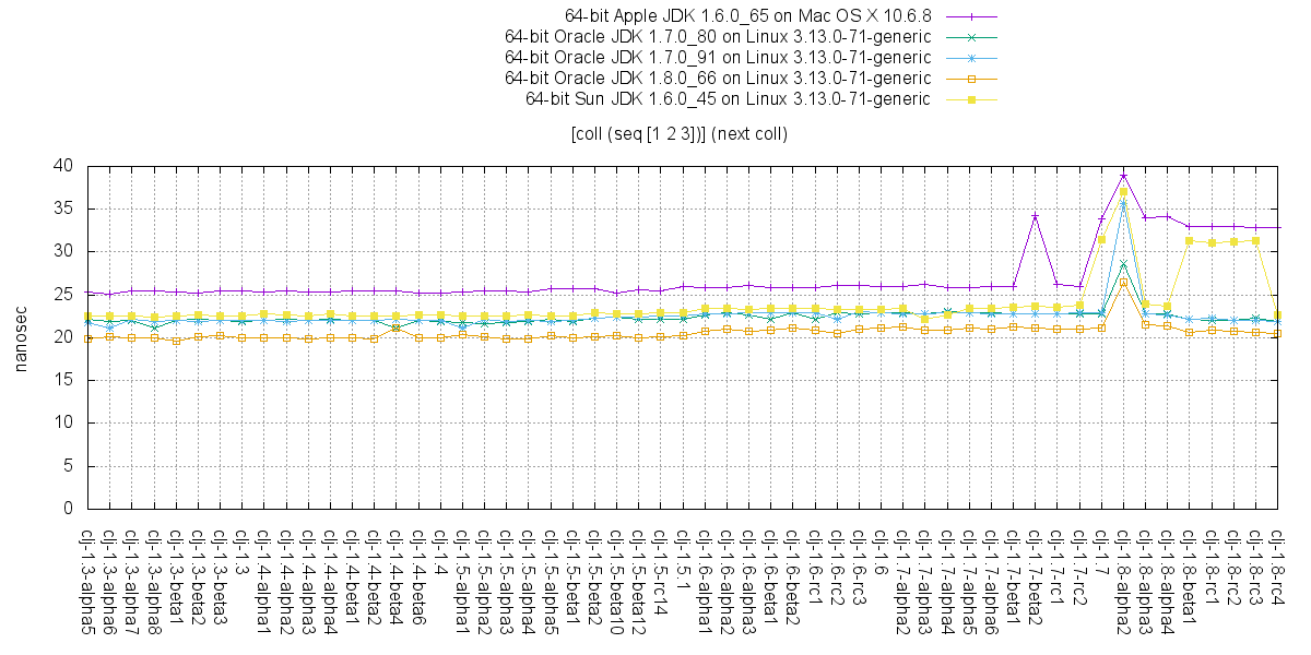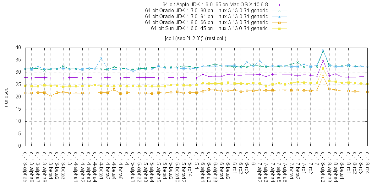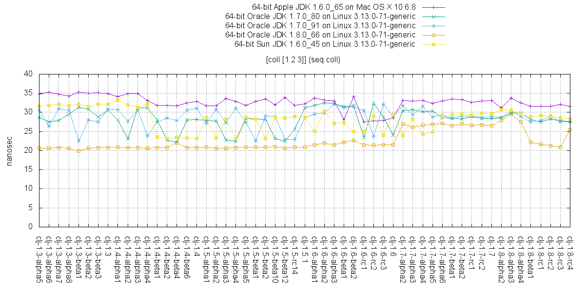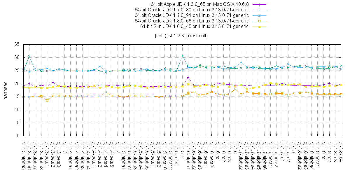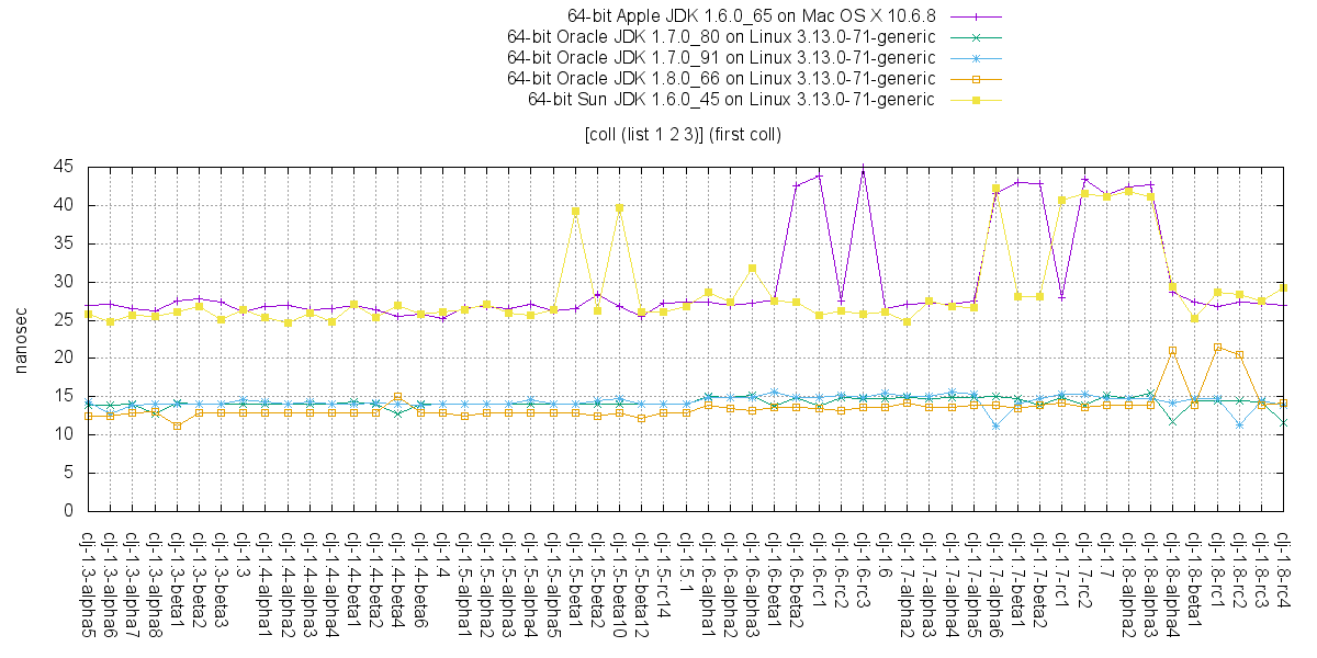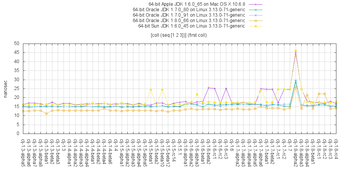 [coll (list 1 2 3)] (first coll) notes: The spikes of longer times in this graph are most likely due to the 3 runs made for each data point having significant variation from one run to the next, and if I had tried several more runs I would get one that was as low as the neighboring results on the same JVM. I don't know the reasons for the significant run-to-run variation.