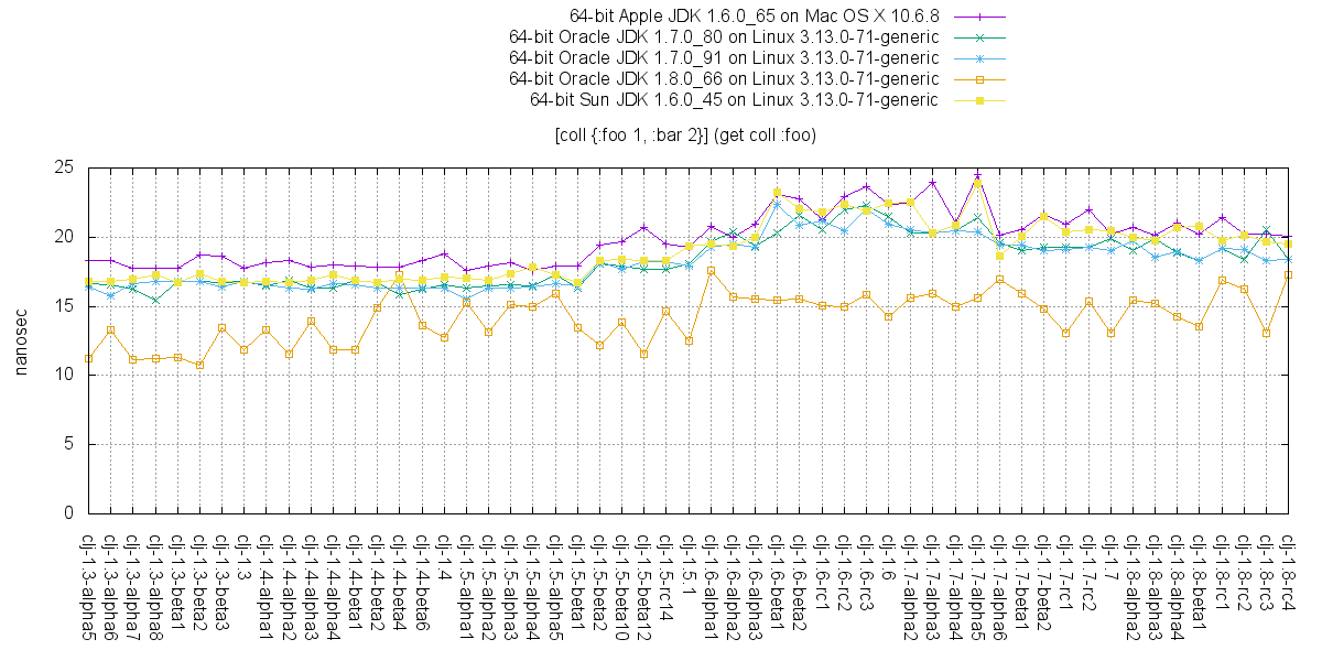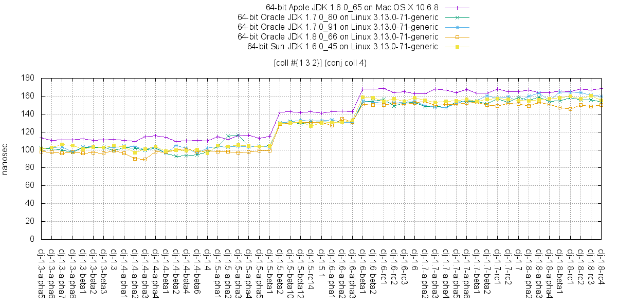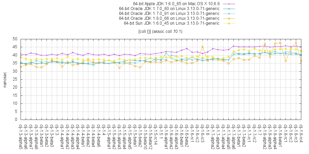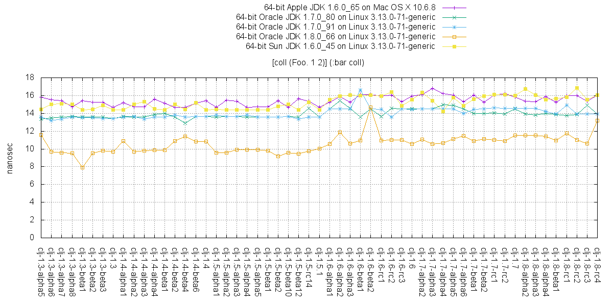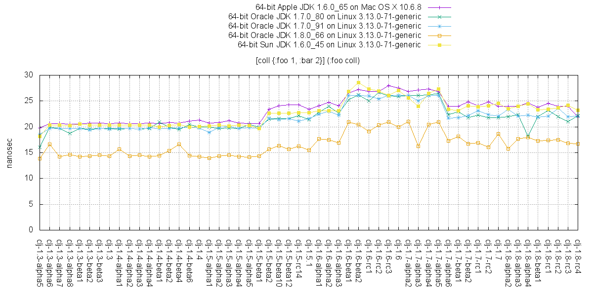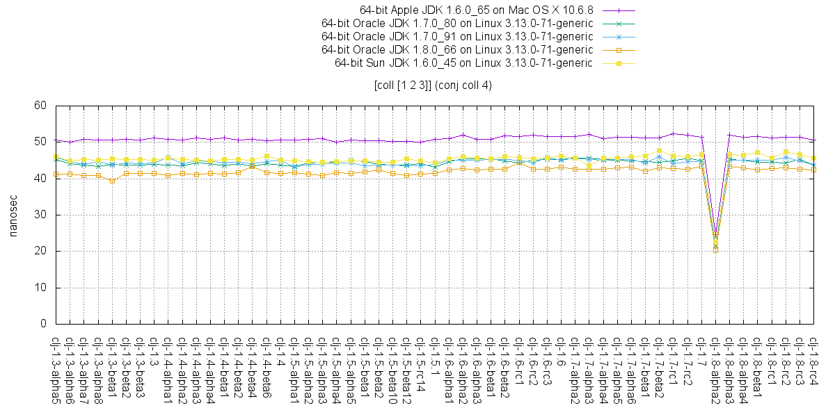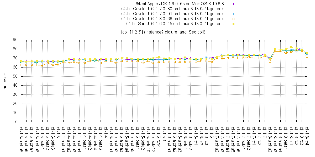 [coll (list 1 2 3)] (first coll) notes: The spikes of longer times in this graph are most likely due to the 3 runs made for each data point having significant variation from one run to the next, and if I had tried several more runs I would get one that was as low as the neighboring results on the same JVM. I don't know the reasons for the significant run-to-run variation.