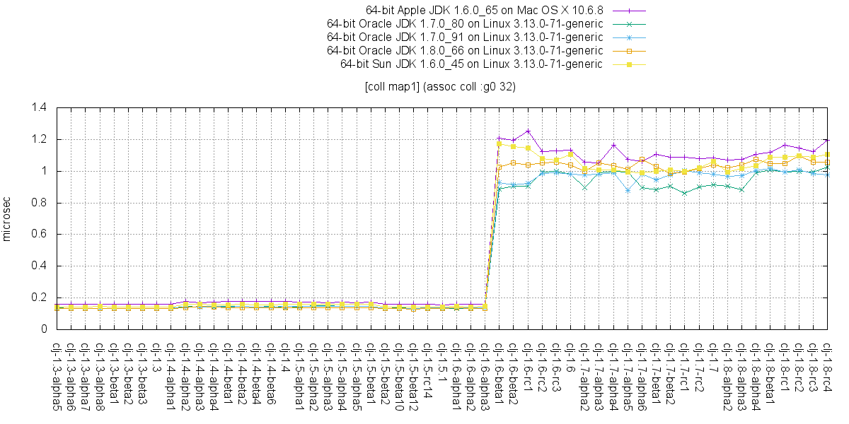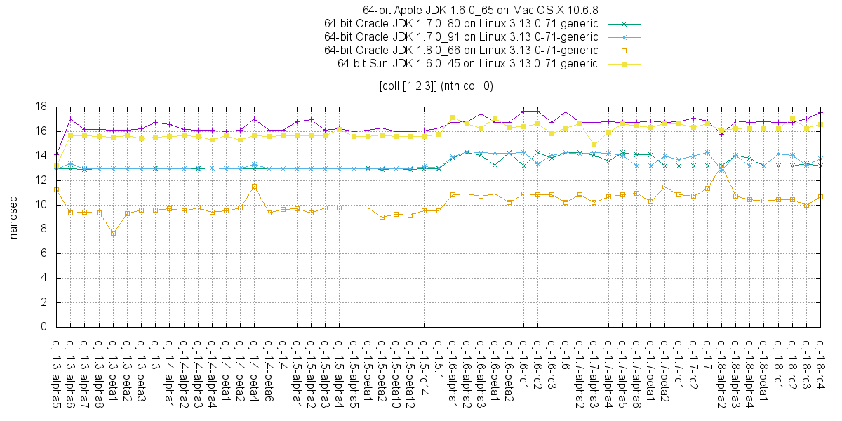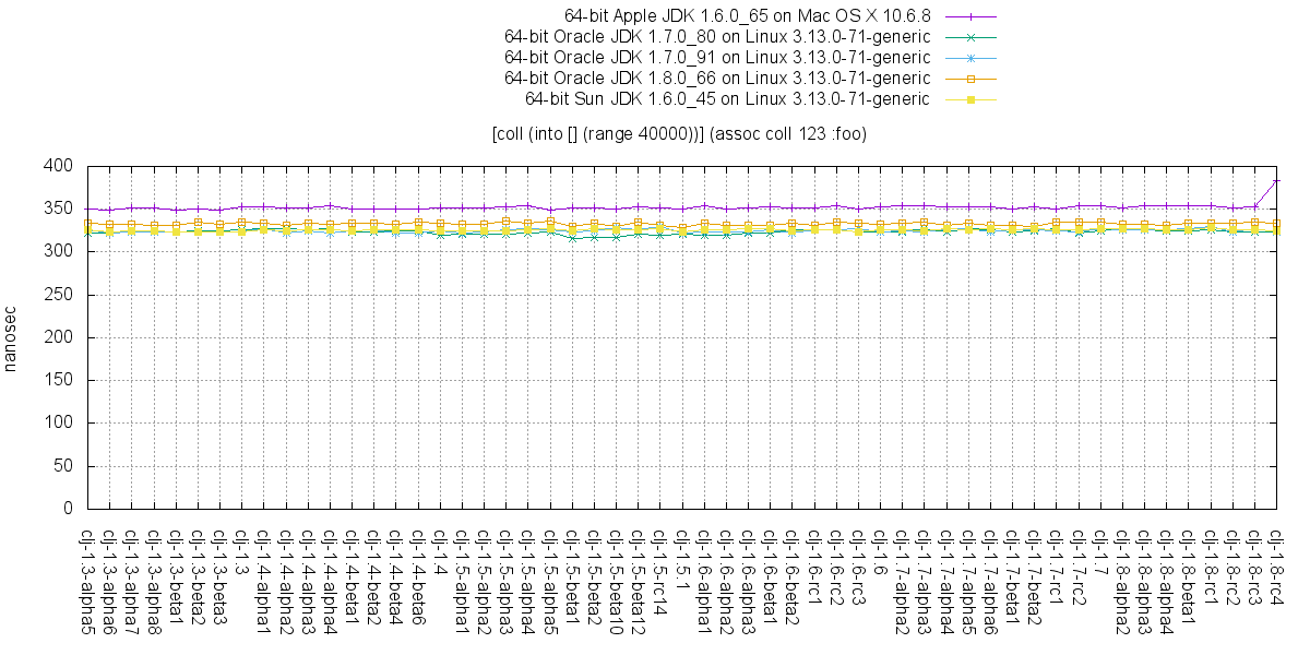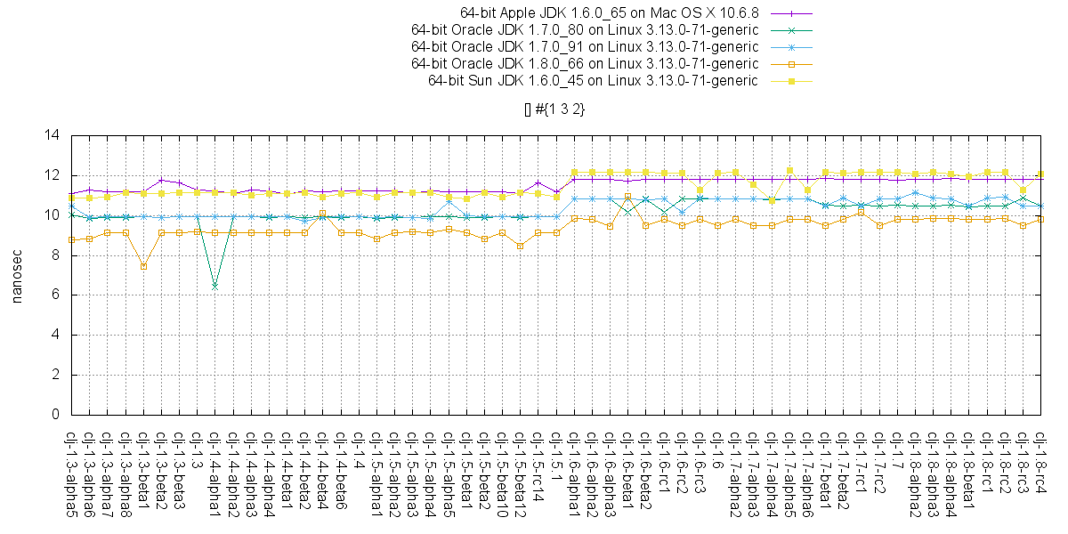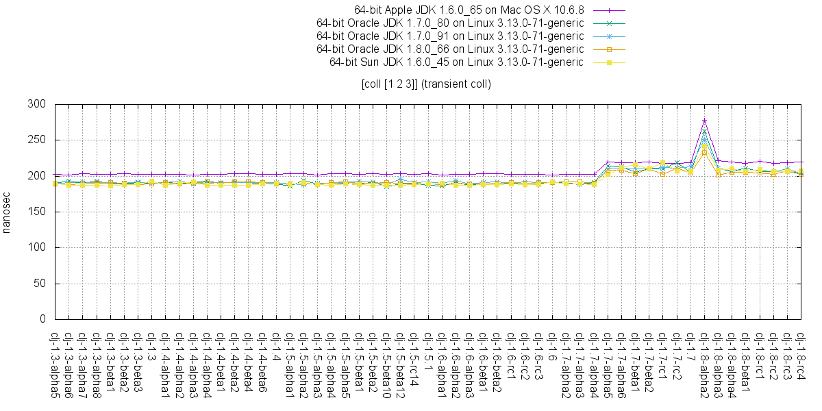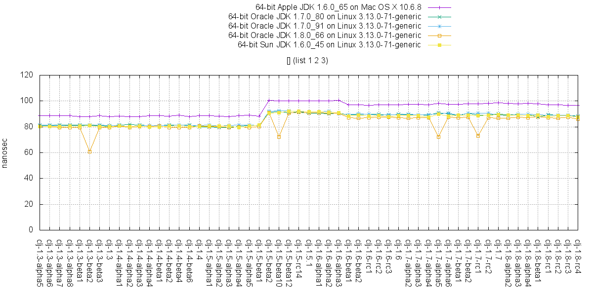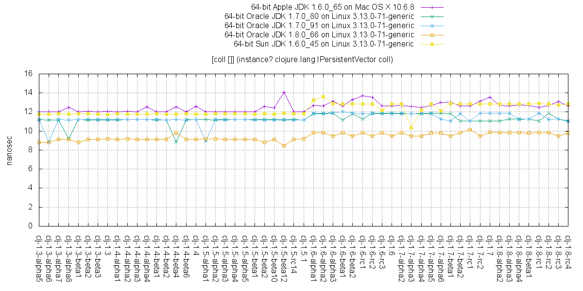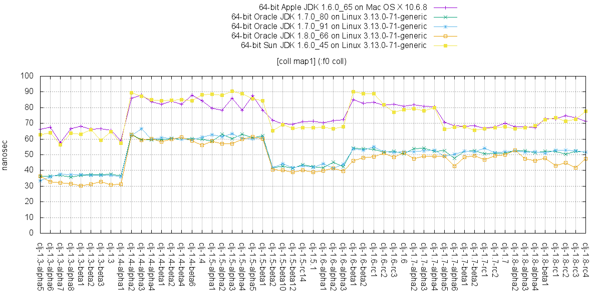 [coll (list 1 2 3)] (first coll) notes: The spikes of longer times in this graph are most likely due to the 3 runs made for each data point having significant variation from one run to the next, and if I had tried several more runs I would get one that was as low as the neighboring results on the same JVM. I don't know the reasons for the significant run-to-run variation.