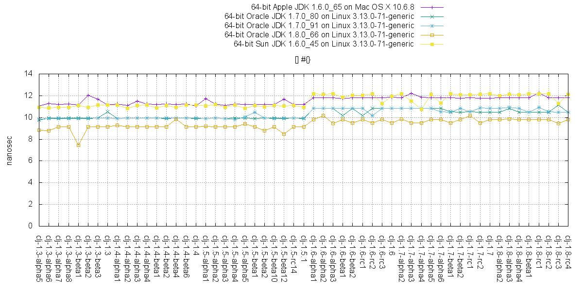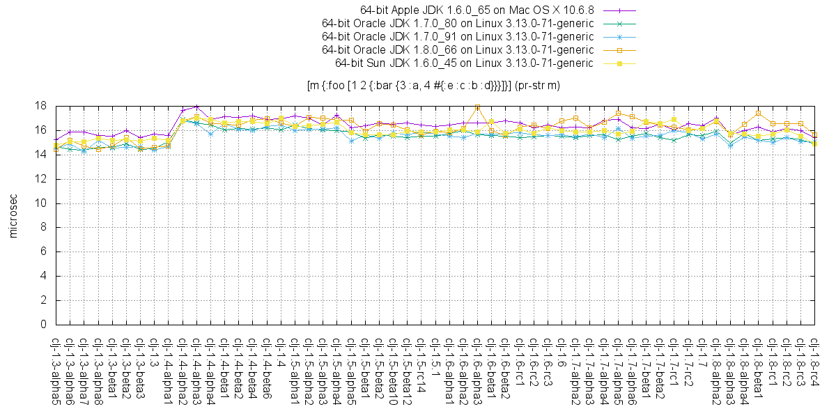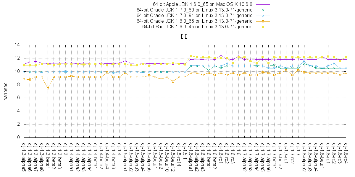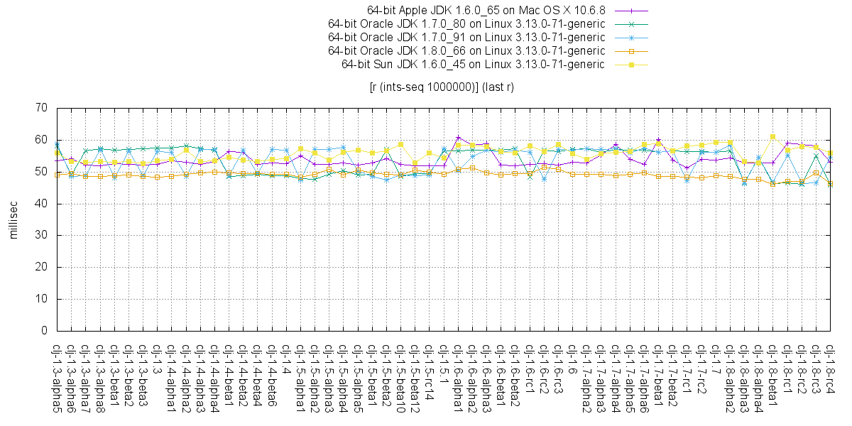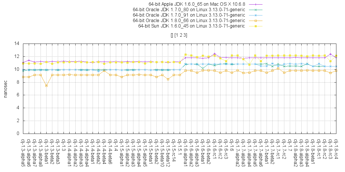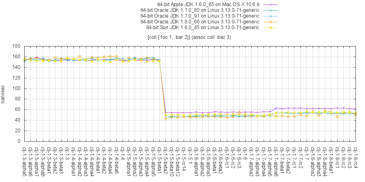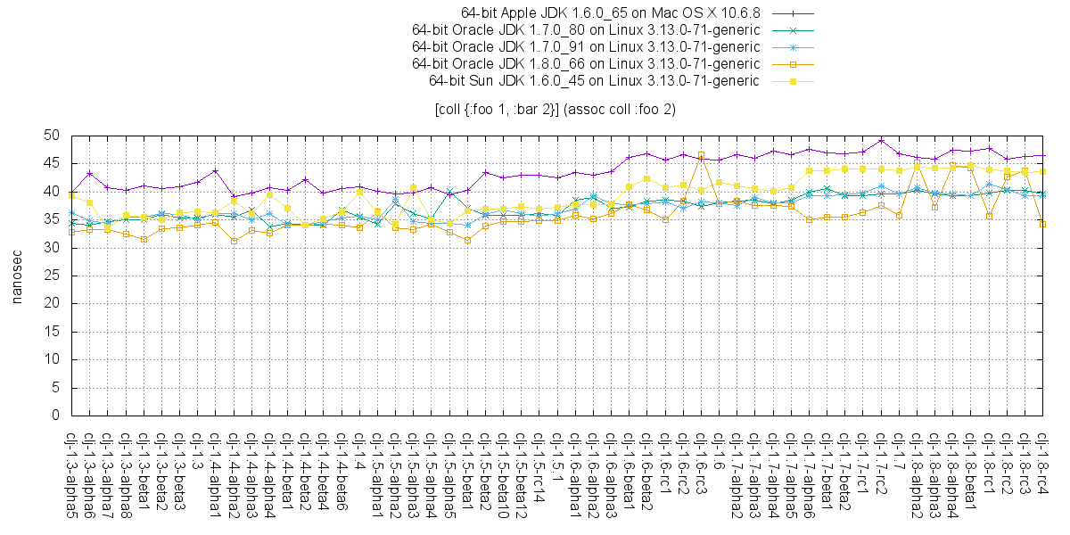 [coll (list 1 2 3)] (first coll) notes: The spikes of longer times in this graph are most likely due to the 3 runs made for each data point having significant variation from one run to the next, and if I had tried several more runs I would get one that was as low as the neighboring results on the same JVM. I don't know the reasons for the significant run-to-run variation.