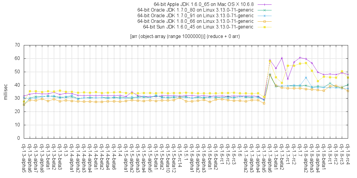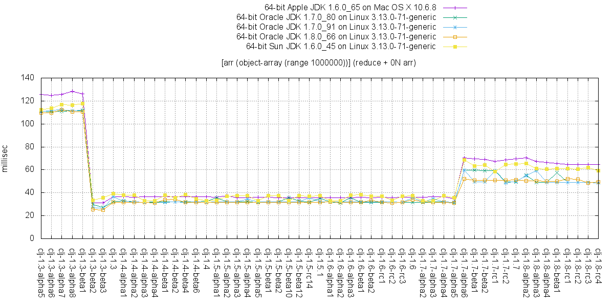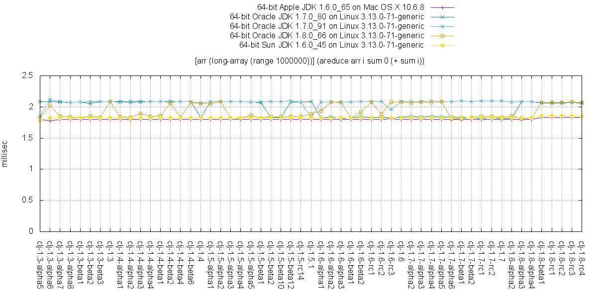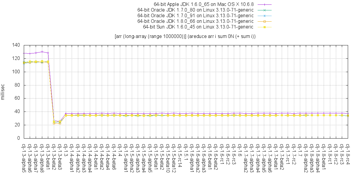 (areduce arr i sum 0N (+ sum i)) notes: TBD exactly which commit(s) between Clojure 1.3-beta1 and 1.3-beta2 led to the much better performance afterwards. Likely it was the same changes that led to the better performance for (reduce + 0N arr) above.