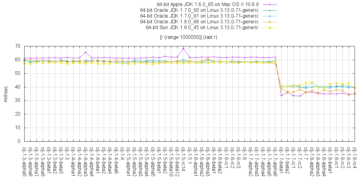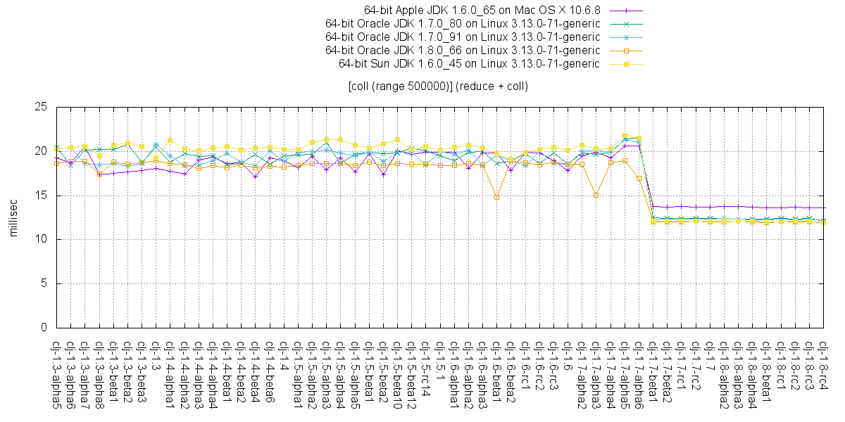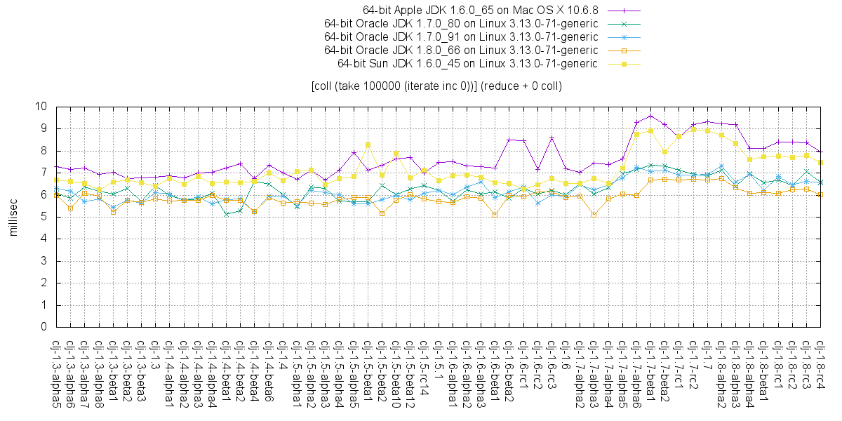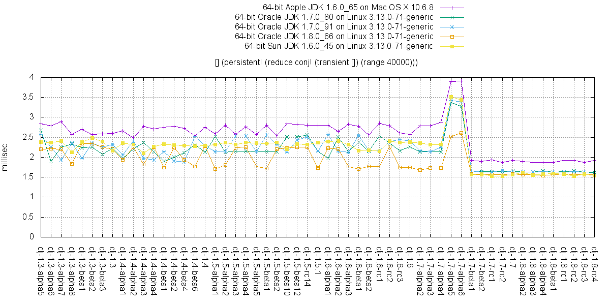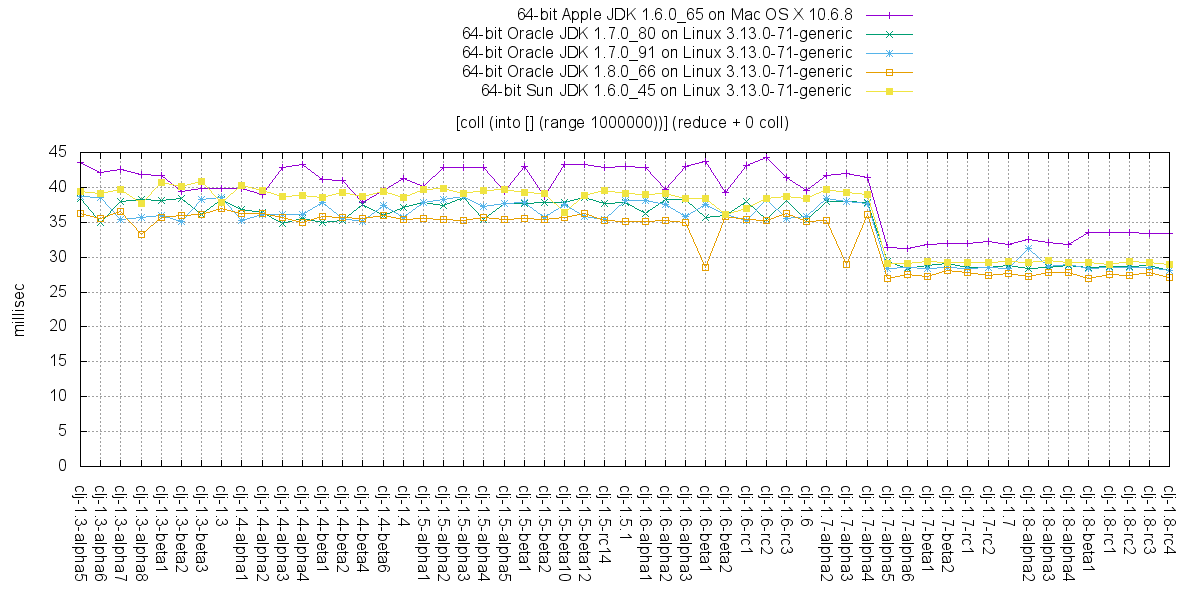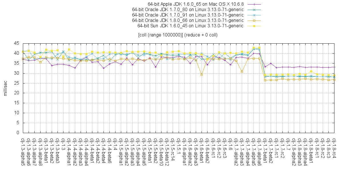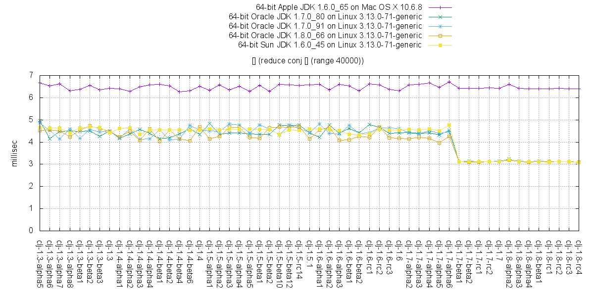 [] (reduce conj [] (range 40000)) notes: TBD why only the 64-bit Apple JDK 1.6 is significantly slower than the others.