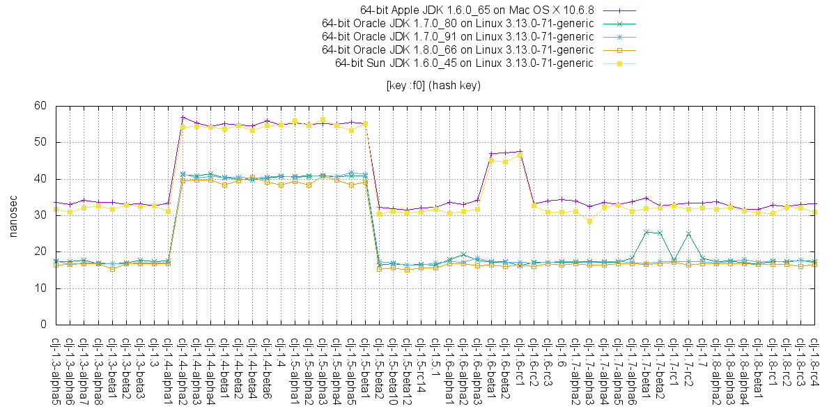 [key :f0] (hash key) notes: TBD exactly which commit(s) between Clojure 1.4-alpha1 and 1.4-alpha2 led to the worse performance afterwards. It obviously appears to have been undone, or improved in some other way, in 1.5-beta2.